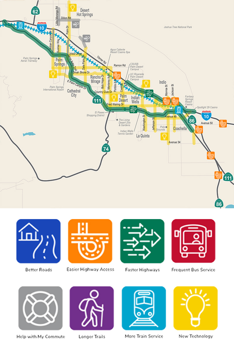 The Traffic Relief Plan is a local strategy to improve traffic flow and safety, keep infrastructure in good condition, reinforce infrastructure from flooding and natural hazards, and drive economic development in the Coachella Valley. Examples of investments include but are not limited to: